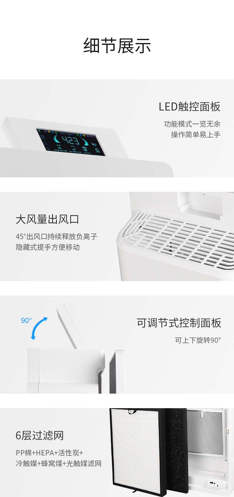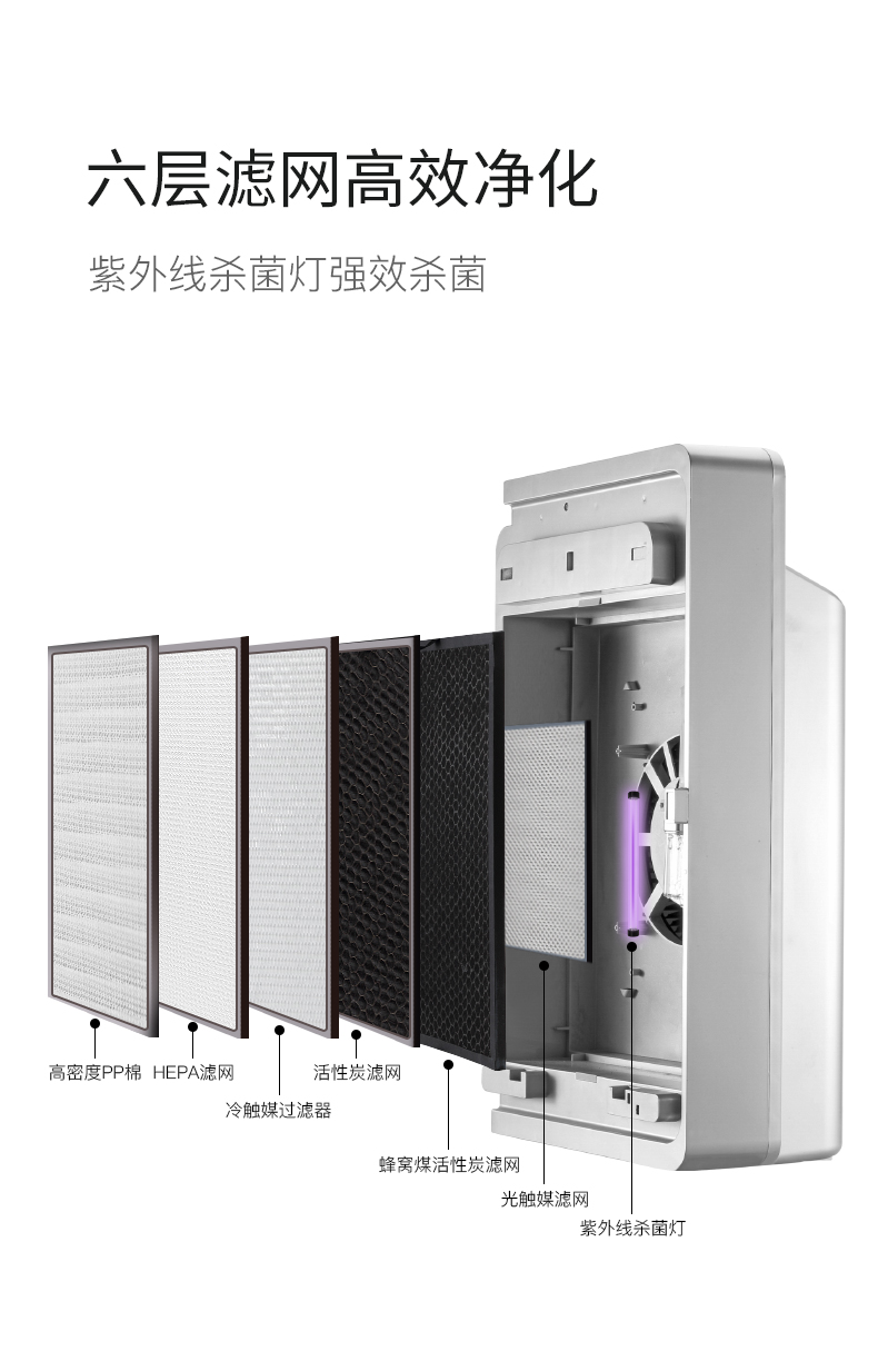 六層復合濾網:有效攔截超細微顆粒,層層捕捉,讓污染無處遁形,過濾效率高達99.99%,輕松搞定日常生活中的懸浮顆粒物、氣態污染物和細菌等。